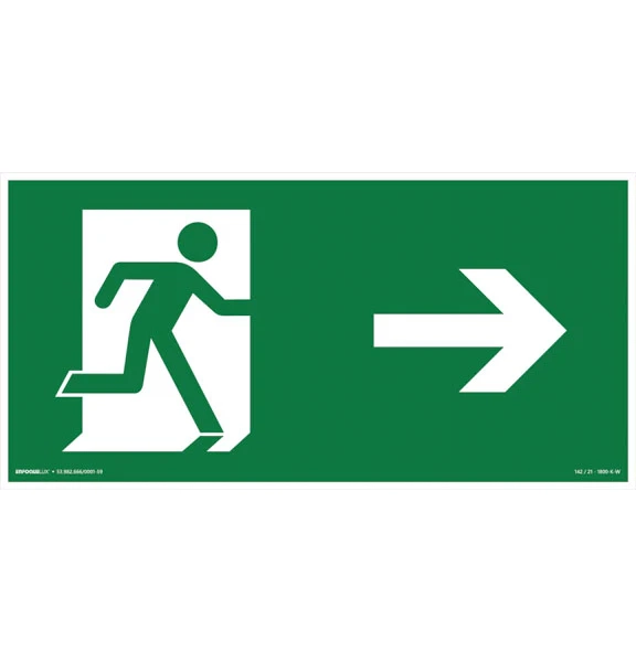 Indica a direção de fuga para a direita, orientando o deslocamento seguro em rotas de emergência.